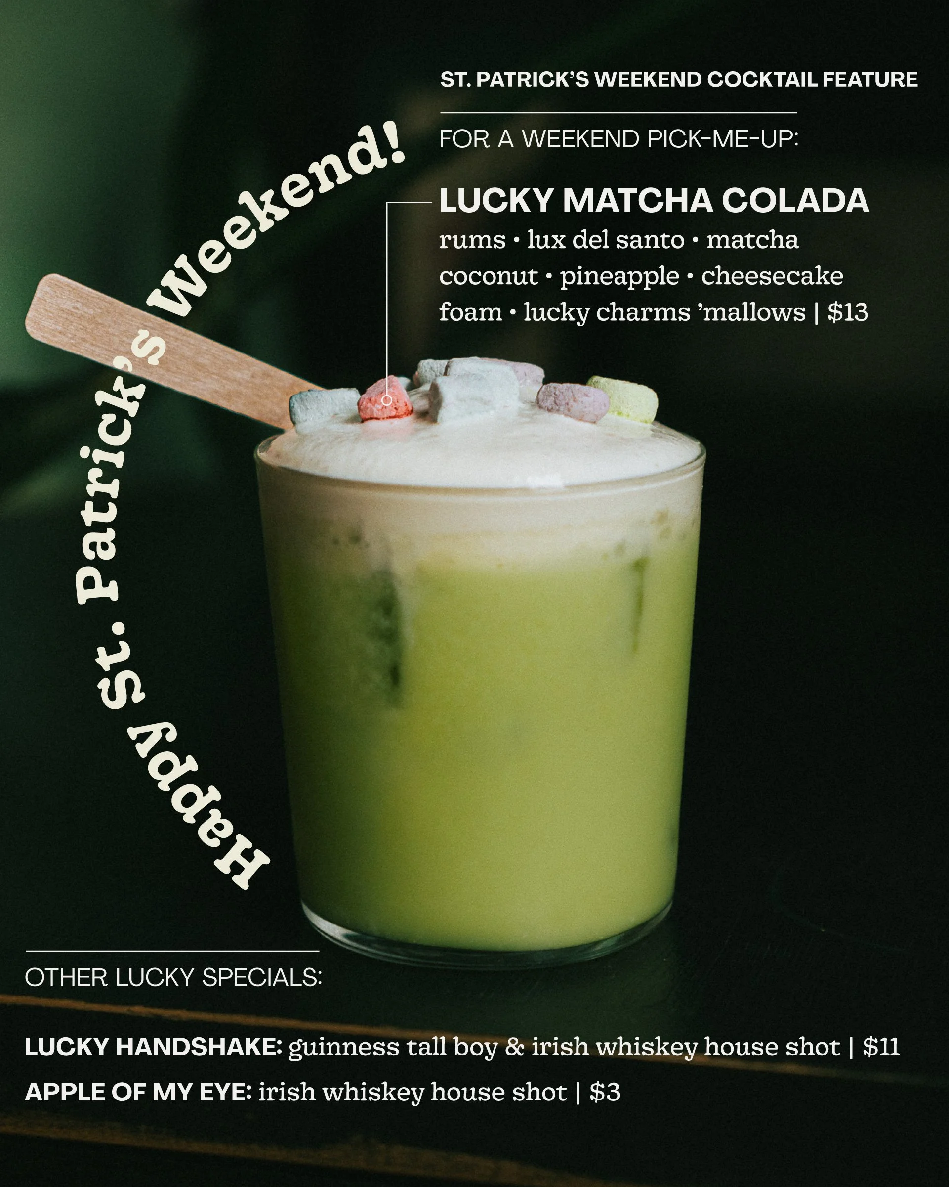 Half-Price Whiskey Pours: Every backbar whiskey is 50% off (2oz neat or rocks). Time to try that bottle you’ve been eyeing!